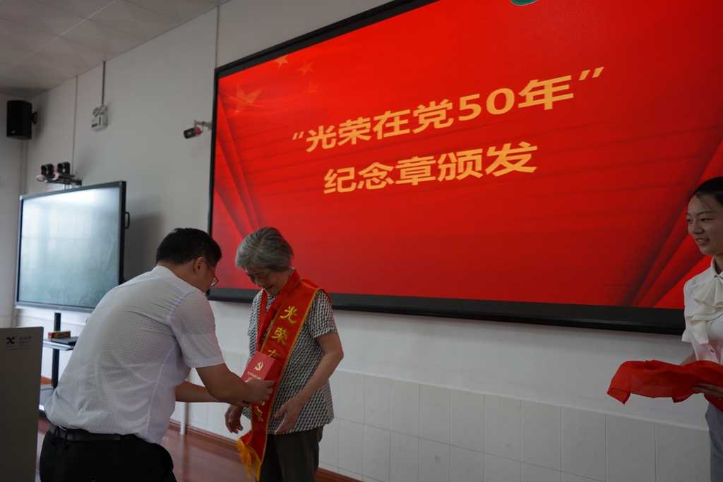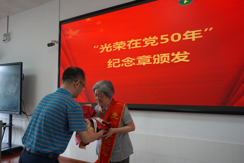 莫道桑榆晚,为霞尚满天。附小党总支书记周凯兴同志为“光荣在党50年”纪念章获得者方群先老师颁发了纪念奖章,党总支组织委员、副校长周玮同志为方老赠送鲜花,表达对老党员们的崇高敬意,也让老党员们感受到了党组织的关怀和温暖。