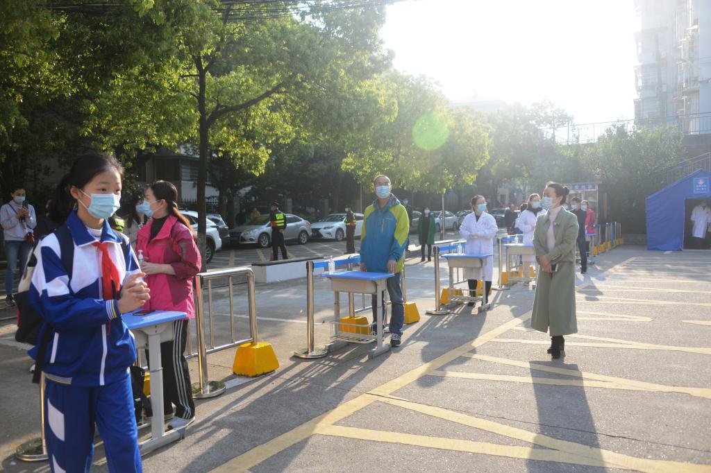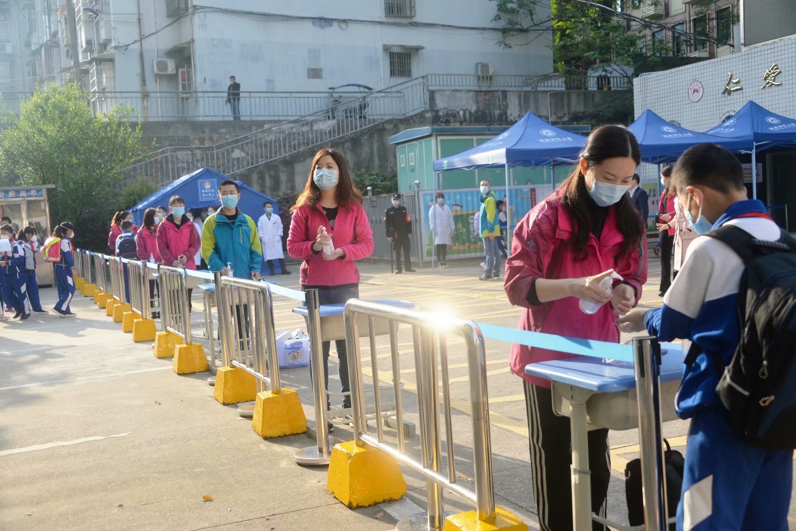 七点五十,入校学生开始增多,但防疫措施丝毫不马虎。为保证学生能快速安全通过,学校开放了七条检测通道,老师指引孩子们间隔一米排队、帮助孩子们用免洗洗手液消毒双手,体温检测正常的学生有序进入校园。