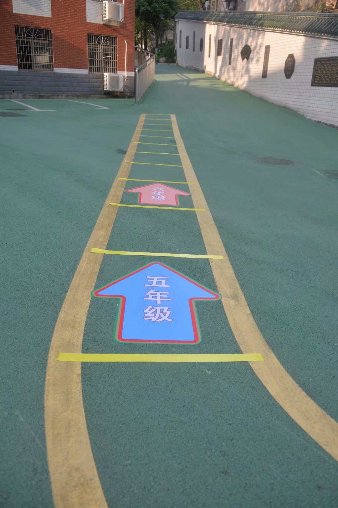 顺利“通关”后,孩子们终于进入校园。首先映入他们眼帘的是地上和校园道路两边醒目的防疫提醒,“自觉排队,间隔一米,双手消毒,测量体温”“戴口罩、勤洗手、常通风”......红黄绿大箭头、可爱的小脚丫指示着每个班级错峰上下楼的路径,每一步都有着严谨细致的安排。