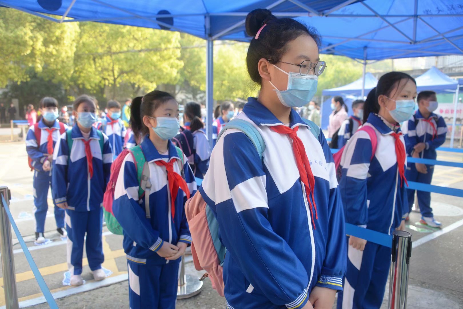 结束了一上午愉快的学习,各年级错峰放学。孩子们在班主任的带领下保持距离、有序地走出校园。
